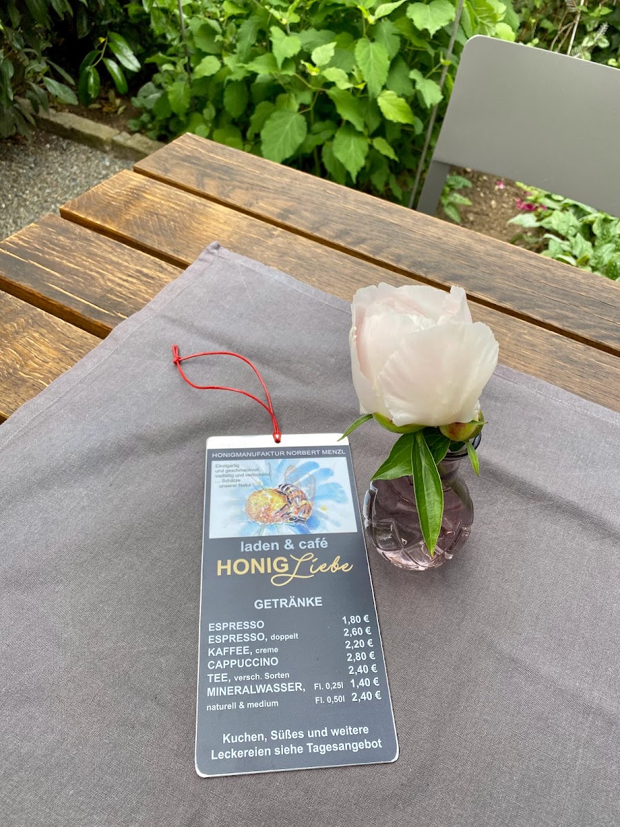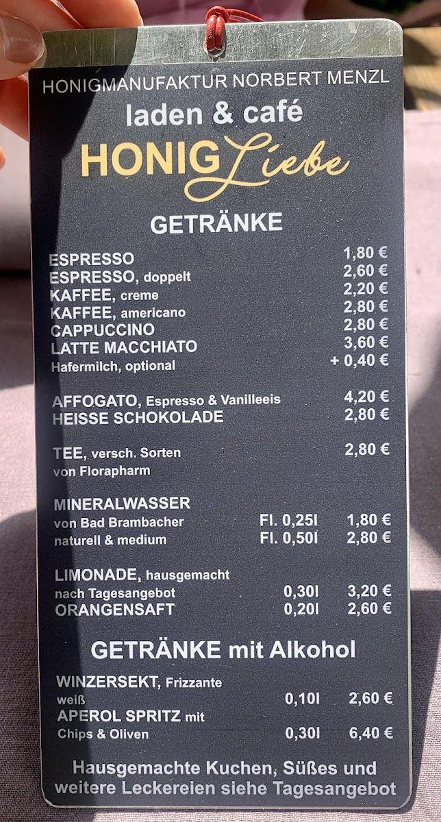 The menu at Honigmanufaktur_Menzl offers a selection of beverages and light food items suitable for various times of the day, including breakfast and coffee breaks. Visitors can find a variety of coffees and teas, reflecting the café's focus as a local coffee and tea store. In addition to drinks, the menu features self-made desserts and baked goods, highlighting options such as carrot cake and other small pastries.